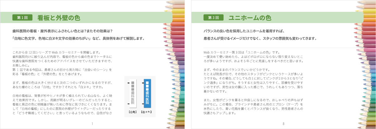 色を上手に取り入れ、歯科医院のブランドイメージや患者やスタッフが気持ちよくなれる居心地のよい空間作りの参考となる資料です。前編、後編となりますが、どこから読んでいただいても色が果たすべき役割や具体例などをわかりやすくまとめています。ぜひご覧ください。