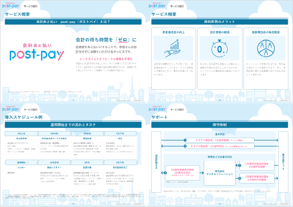 本資料では今注目されている医療費のあと払いサービスをご紹介いたします。「会計あと払い post-pay」のリリースに至るまでの開発背景や、サービス概要を詳しくまとめました。また、導入検討に際して運用の流れや導入スケジュール、費用などについてもご紹介しています。さらに、本サービスを導入する有効性や導入時の費用のシミュレーションといった内容も詳しく記載しています。
